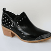 Botín cuero richato negro taco medio. Detalle punta cuero pitón, talón y borde empeine con tachas color plata. Cierre en parte interior del pie para facilitar poner y sacar.
